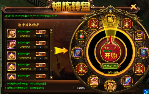 活动规则:可使用背包仓库内已有的就道具进行神炼,获取神炼值可以抽奖获得新道具