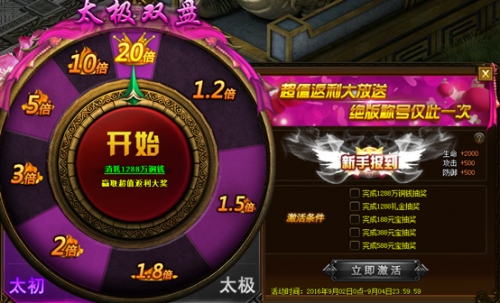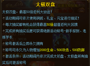 活动规则:活动期间可依次使用铜钱,礼金,元宝进行抽奖,每次抽奖都有机会获得最高50倍超值返利大回馈,完成所有抽奖后可获得绝版称号