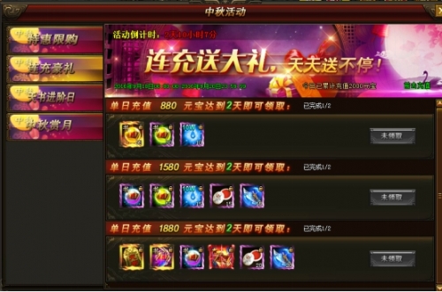 活动说明:活动期间内,充值达到相应的金额即可领取海量奖励,奖励天天送不停!赶快来参加吧!