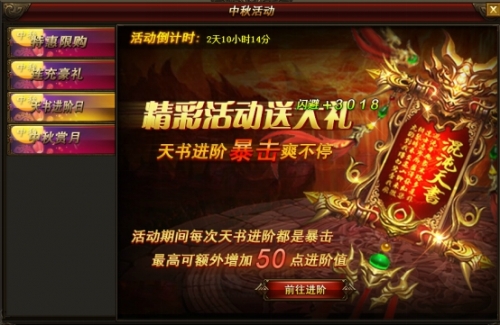 活动说明:活动期间内每次天书进阶都是暴击,最高可额外增加50点进阶值。想让战力飞起来吗?那还等什么!赶快来参与吧!