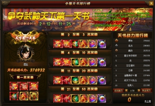 1、活动时间内根据天书总战力进行全平台排名,排名实时刷新。