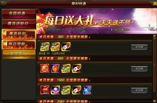 活动内容:活动时间内,每日充值达到一定额度可领取对应奖励,每天0点清空充值额度