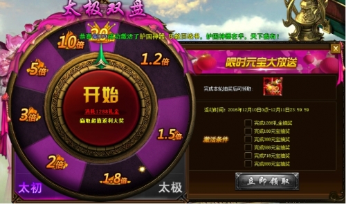 活动时间:2016年12月10日00:00:00-2016年12月11日23:59:59 活动规则:活动期间可依次使用铜钱,礼金,元宝进行抽奖,每次抽奖都有机会获得最高20倍超值返利大回馈。 实际内容以游戏内为准,图片仅为样式参考