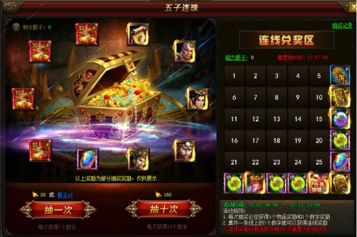 活动时间:2016年12月10日00:00:00-2016年12月13日23:59:59 说动说明:1.每次抽奖必定获得一个物品奖励和1个数字奖励 2.集齐一条线上的5个数字就可以获得连线奖励 3.连线奖励及激活数字每日0点重置为初始状态