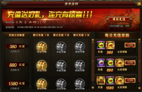 活动期间内累计充值1-3天且达到一定额度可领取对应奖励,另有每日充值额外奖励