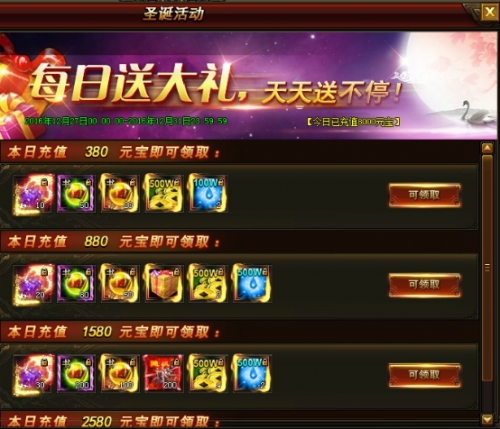 活动内容:活动时间内,每日充值达到一定额度可领取对应奖励,每天0点清空充值额度