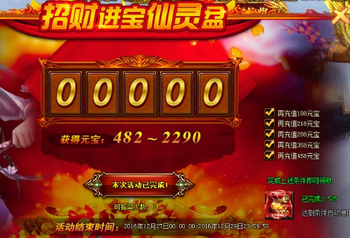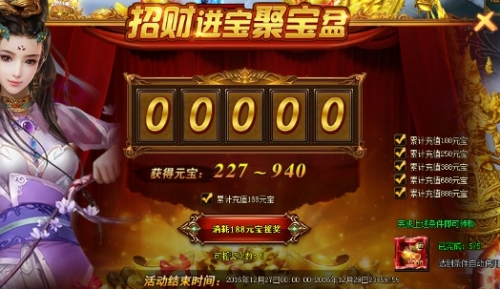 活动规则:聚宝盆——需要累积充值达到一定的元宝后,可以额外获得额外的限时元宝奖励(奖励直接到帐,每日清0,请及时使用)同时可以进行消耗元宝摇奖,必定会获得多倍的元宝奖励。
