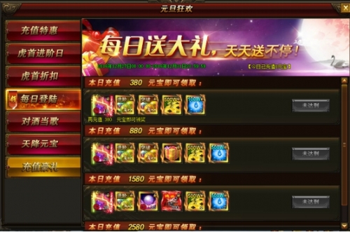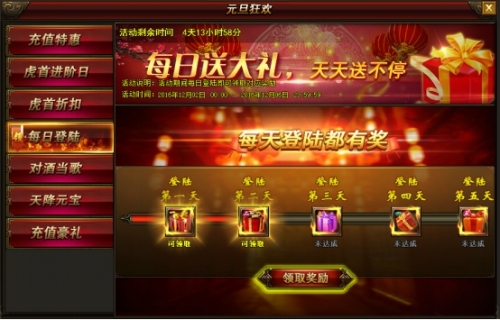 活动内容:活动时间内,每日充值达到一定额度可领取对应奖励,每天0点清空充值额度