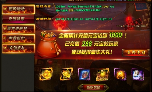 1.13奖励:全服满1000元宝,充值满288元宝 |