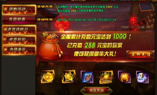 活动规则:活动期间,每天服务器内的玩家累计充值满1000元宝所有充值满288元宝的玩家都有豪礼相送!
